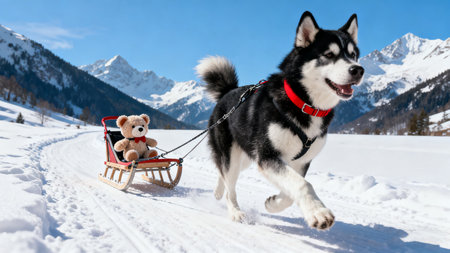 Sled dog with teddy bear on the background of snowy mountains