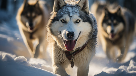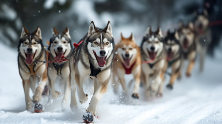 A dynamic pack of huskies dashes through a snow covered trail embodying strength and vitality Their powerful strides create an enchanting scene of winter wilderness