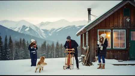 Young couple with dog in front of house in the mountains at winter