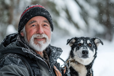 Senior musher wearing winter clothes is smiling next to his Alaskan husky dog in a snowy forest