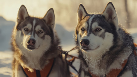 Beautiful huskies resting in the snowy landscape during sunset in a winter wonderland