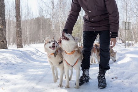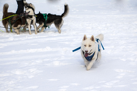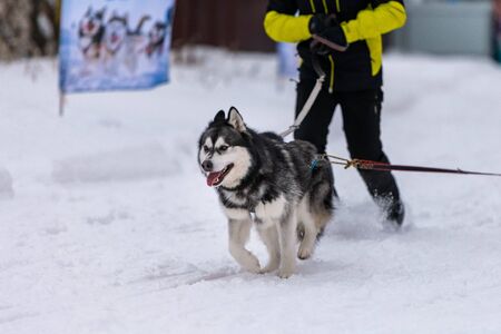Reshetiha, Russia - 02.02.2019 - Sled dog racing. Husky sled dogs team pull a sled with dog musher. Winter competition.