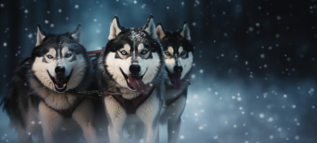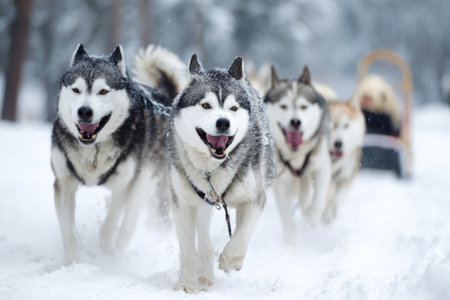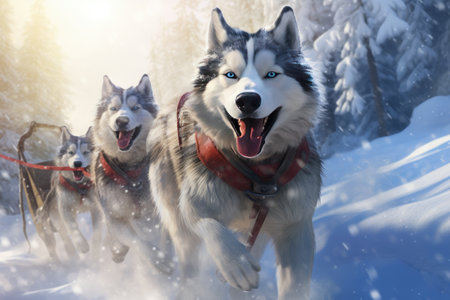 Husky sled dogs enthusiastically pull a sled through the snowy wilderness during winter, showcasing their strength and teamwork