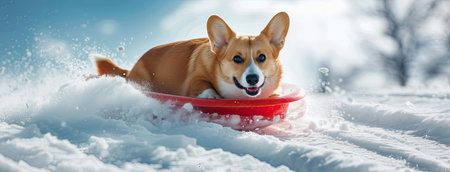 a cute corgi as it enjoys bobsledding with a cool face, its full body figure gliding down the snowy slope with a playful expression that radiates joy and excitement