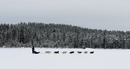Sledding with husky dogs in winter forest. Lapland, Finland