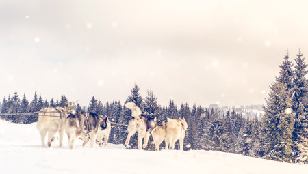 Dog team pulls a sleigh in the depths of Alaska