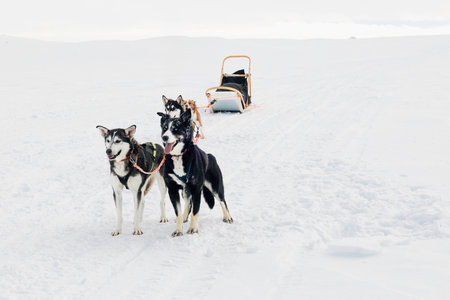 Team of husky sled dogs with a wooden sleigh, standing on white snowy tundra landscape, strong, happy, focused dogs, Finnish Arctic circle, Tarvantovaara Wilderness Area, Finland