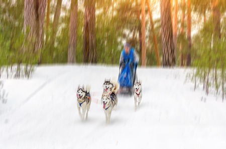Sled dog racing. Team consists of man musher and four Siberian Husky breed dogs. Pine forest background. Motion blur effect.