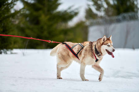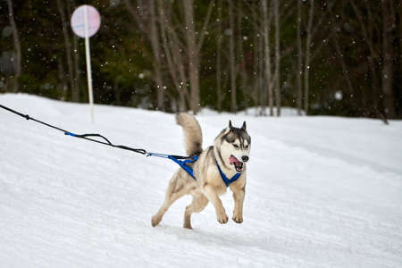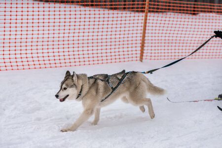 Running Husky dog on sled dog racing. Winter dog sport sled team competition. Siberian husky dog in harness pull skier or sled with musher. Active running on snowy cross country track road