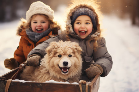 adorable little kids having fun on a sled in the winter park