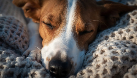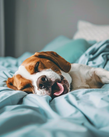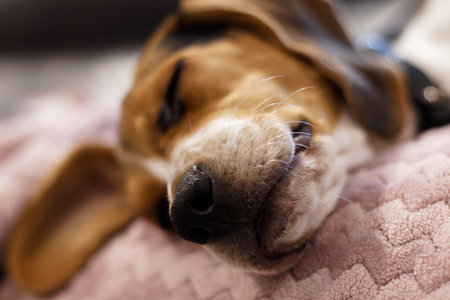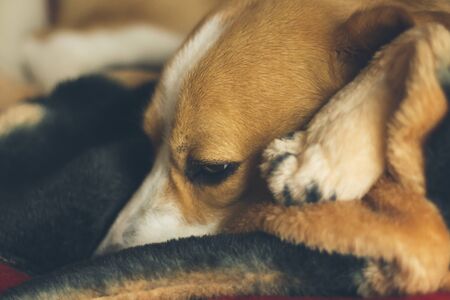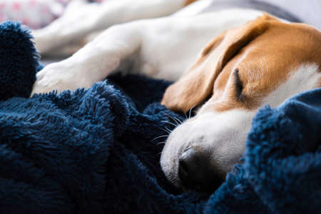 Adorable Beagle dog lying in bed and sleeping. Close up