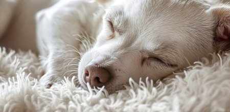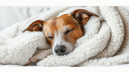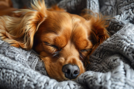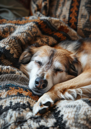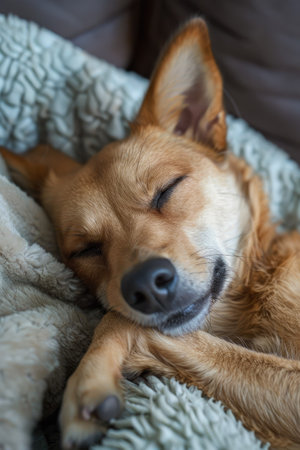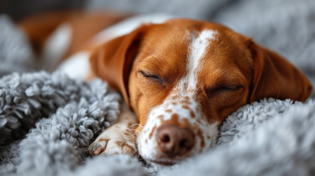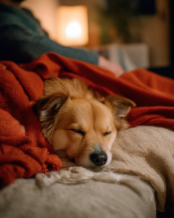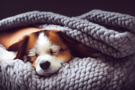 A serene and cozy scene featuring a dog peacefully sleeping under a soft blanket, radiating warmth and tranquility in a comfortable indoor setting.