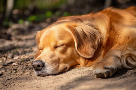 A golden retriever is resting comfortably with eyes closed on the warm sandy ground in a serene forest setting.