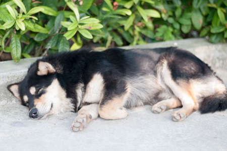 Close view of a domestic dog with a lazy attitude on the outdoor.