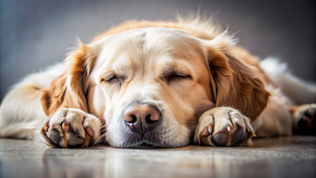 Witness pure tranquility: a sleeping golden retriever puppy embodies serene companionship This gentle scene hints at a deeper friendship, though a cat isn't pictured, imagine it nearby, sharing peaceful slumber Together, they create a beautiful moment of calm, illustrating the essence of peaceful togetherness and shared rest AI Generative