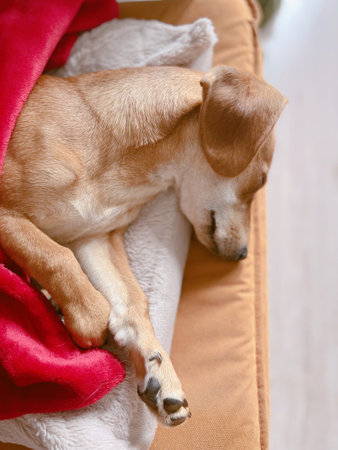 Portrait of a cute dog sleeping on a soft blanket.