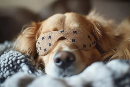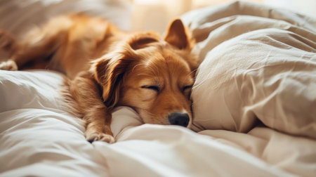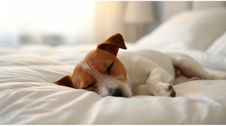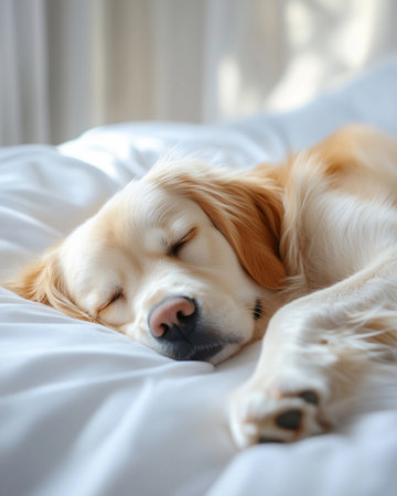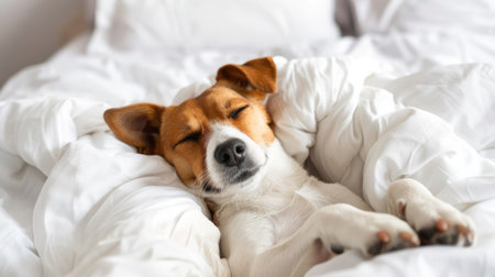 Content dog sleeping on cozy white bed with soft blanket, ample space for text placement
