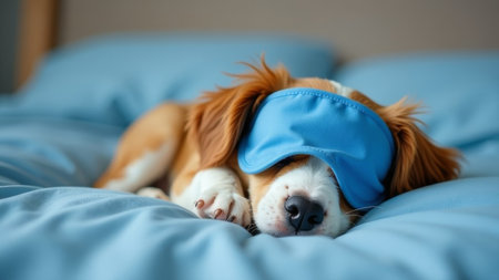 beagle dog lies in bed with soft toys in a sleep mask.