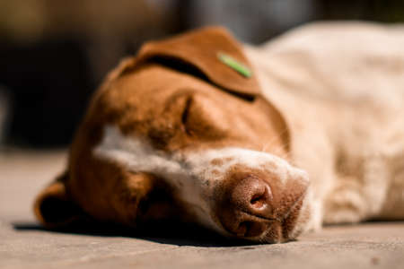 weimaraner dog breed sleeping on the floor, close-up dog's nose
