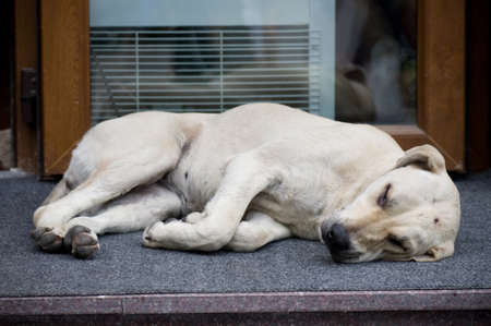 Abandoned lonely stray dog sleeping on the city street, selective focus