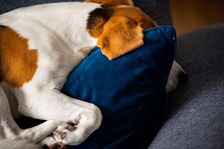 Beagle dog tired sleeps on a cozy sofa in fanny position. Dog background theme