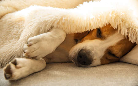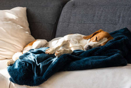 Beagle dog tired sleeps on a cozy sofa, couch, under fluffy blanket. Dog at home concept.
