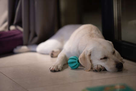 Falling asleep labrador dog on blurred house Generative AI