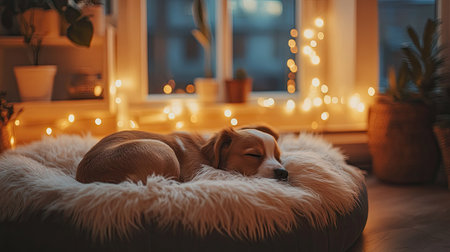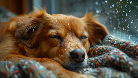 Generative AI, cute dog sleeping on cozy warm blanket near the window, hygge style