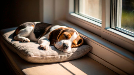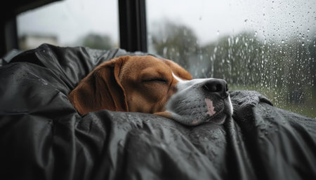 A serene Beagle rests on a windowsill, gazing peacefully at the rainy world The pattering rain creates a tranquil atmosphere, enhancing the dog's relaxed expression This image captures a moment of quiet contemplation and invites you to share in the calm beauty of a rainy day indoors with this peaceful AI Generative
