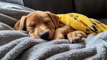 A charming puppy peacefully sleeping under a yellow blanket, surrounded by soft fabric. The scene captures the essence of comfort and tranquility in a cozy home environment.
