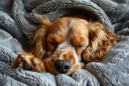 an adorable sleeping dog, a cocker spaniel, cozily wrapped in a gray blanket. The dog's eyes are closed, and it seems to be in a peaceful slumber, offering a sense of tranquility and comfort
