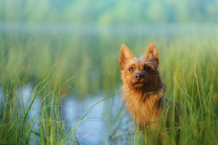 Australian Terrier peeking out of the grass. Walking the dog by the lake. The pet is resting in nature