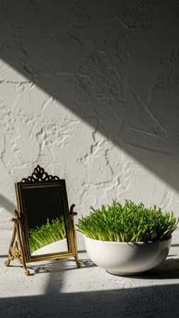 A tall, vertical 9:16 image of a Navruz Haft-Seen element. A small, elegant gold mirror and a cerami