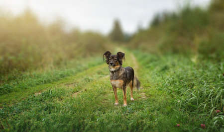 A stray dog walks in the grass. With photographed close up.