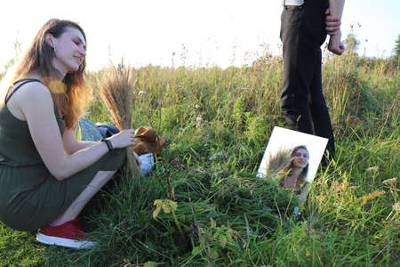 A modern round mirror lies on a grass and a blue sky is reflected in it. Dry faded yellowed grass in late summer - early fall. Golden ears of wheat. Harvest time. Trendy image, close to nature concept