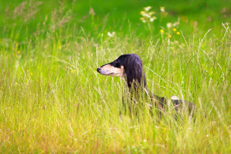 Little black dog standing in a meadow, looking aside, green grass background