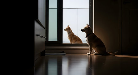 Two dogs sit side-by-side in silhouette, looking out a large glass door into the daylight. The image captures a moment of loyalty, waiting, and domestic companionship in a sunlit room.
