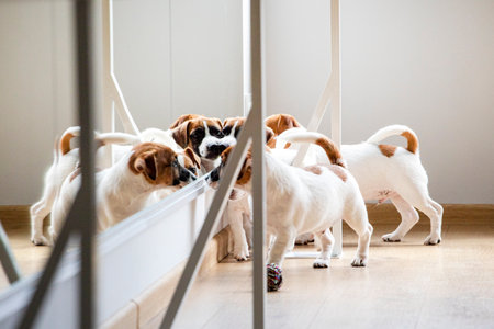 Jack Russell terrier puppies look in the mirror in the fitness room