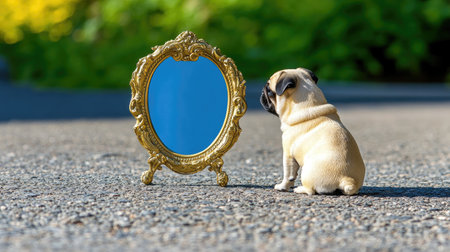 A charming pug dog sits before an ornate golden mirror, reflecting its image against a vibrant outdoor backdrop. This scene captures curiosity and playful innocence.