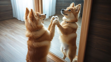 A charming puppy gazes at its reflection in a mirror, showcasing its curiosity and innocence. This delightful moment captures the playful spirit and warmth of a young pet.
