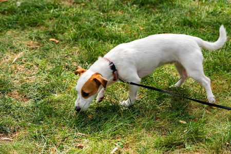 Cute jack russel puppy pet dog looks for something on the grass