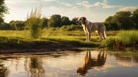 Dog by the river in spring time