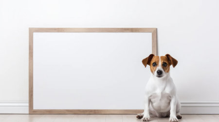 A charming dog poses with an empty frame on a clean white canvas
