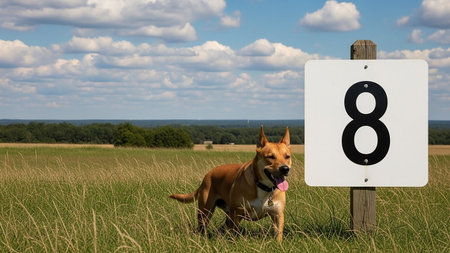 Brown dog standing in a field near a white sign displaying the number eight