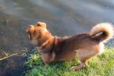 a small red dog walks on the grass on the street