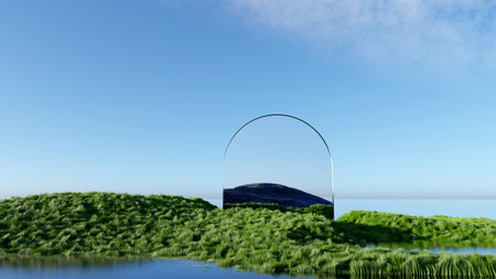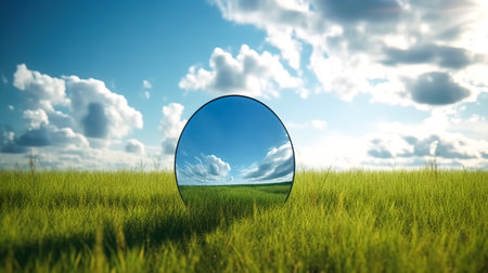 A round mirror in the field reflects the grass and the blue sky with clouds.