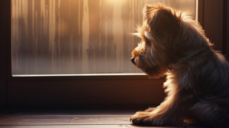 A close-up of a thoughtful dog gazing out the window, reflecting emotions and tranquility with warm light enhancing its presence and character.