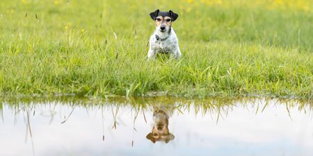 Dog sitting over dripping wet meadow. Small jack russell terrier seven years