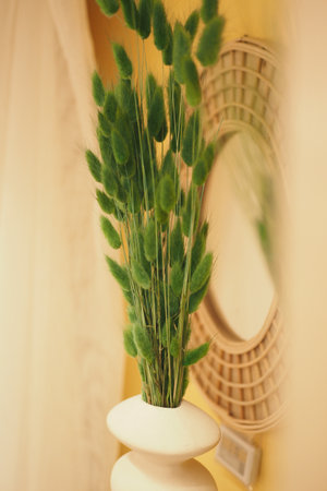 Trifolium arvense. Close up bouquet of wild fluffy flowers indoors in vase, reflection mirror, abstract retro style, vintage toned photo. Selective soft focus.