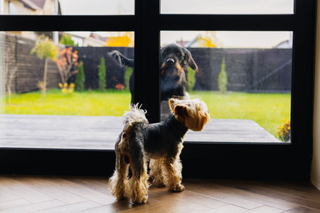 Two dogs - a big one and small one - looking through a glass door at each other in a home setting. A Yorkshire terrier and Drahthaar looking through a glass door. Canine animals. Pets friendship.